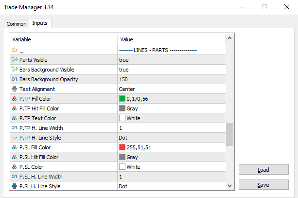 - P.SL Fill Color – background bar fill color for unrealized SL parts