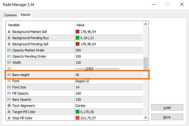 - P.TP Hit Fill Color – background bar fill color for realized TP parts