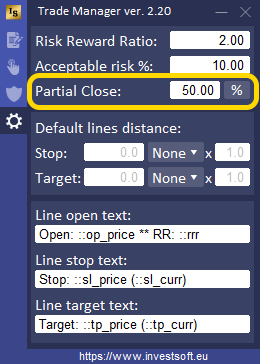 If we set 50% and we have an open order of for example 0.24 lots, then after clicking the “Close 50%” button Trade Manager will close 0.12 lot of the transaction. After re-clicking “Close 50%” 0.06 lot will be closed, the next click will close 0.03 lot and so on..