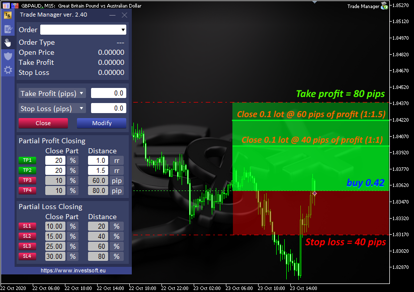 The level where the part of the trade should be closed also can be defined as the distance from the opening price in pips or as a percentage of the distance from the opening price to the take profit or to the stop loss.
