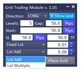 For example, if the fixed lot is 1.00 and Lot Multiple is set to 2, the first order is 1.00, the next one doubles to 2.00, the third becomes 4.00, the fourth 8.00, and it keeps increasing by the same multiplier with each step.