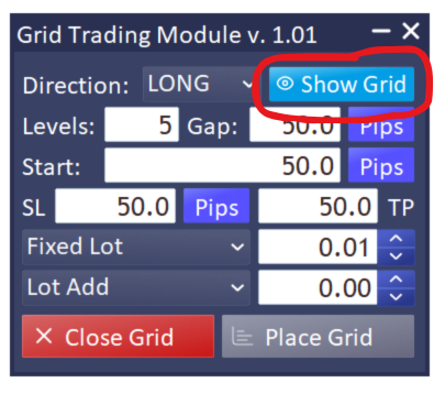 Once all parameters are set and you are ready to see your plan, you can draw the grid directly on the chart. Next to the Direction field you will find the Show Grid button.