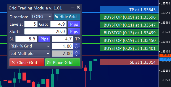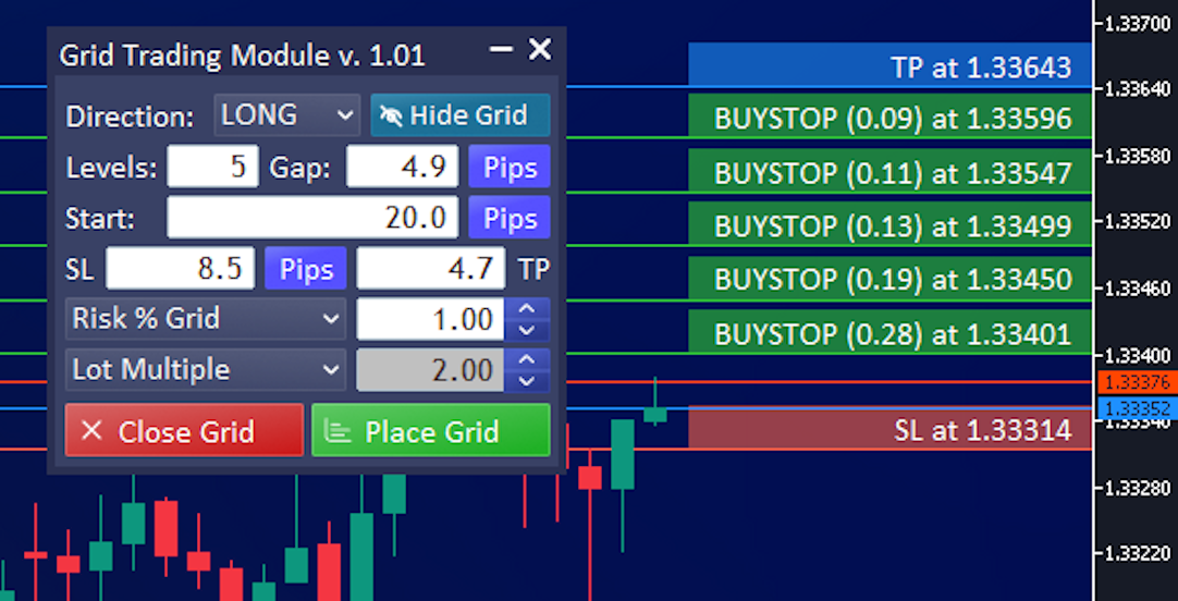 Price: 80 USD Grid Trading Module lets you design and place visual grid orders in MT4 and MT5 in just a few clicks, with clear control over levels, gaps, SL and TP, and lot or risk. It works together with Trade Manager on the same chart and cannot run on its own.