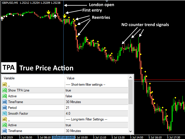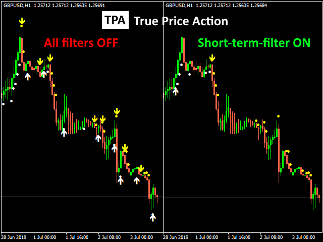 If you turn those filters off, you get pure price action signals with all counter-trend-signals. Ideal for scalpers.