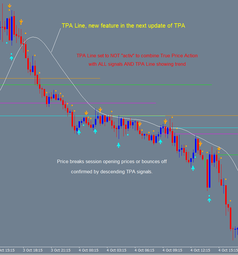 The following pictures showing TPA True Price Action indicator with the new TPA Line and our TPA Sessions indicator (colored lines of Tokyo, Frankfurt, London and New York sessions opening prices)