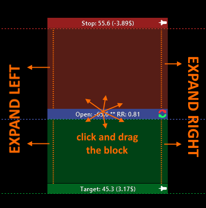 The entire block can be freely moved in the chart area by clicking on the opening price bar and also widening and narrowing the entire block by clicking and moving the mouse at the right or left edge of the block.